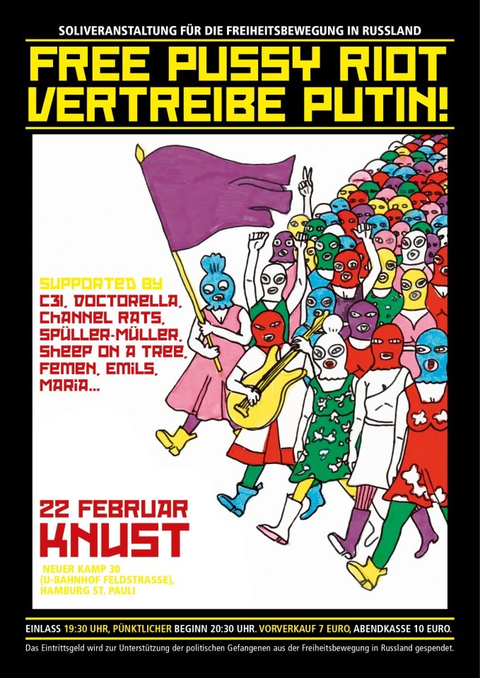 On February 22, 2013 Masha (with Wassily Zittel and Clips) sang the song of Yanka Dyagileva “Vysche nogi ot zemli (Выше ноги от земли) at the benefit concert for political prisoners in Russia. The concert supported “Pussy Riot” and the May 6th prisoners and it was organized together with alternative music groups from Hamburg and Berlin on a stage of the “Knust” musical club in Sankt Pauli, Hamburg.