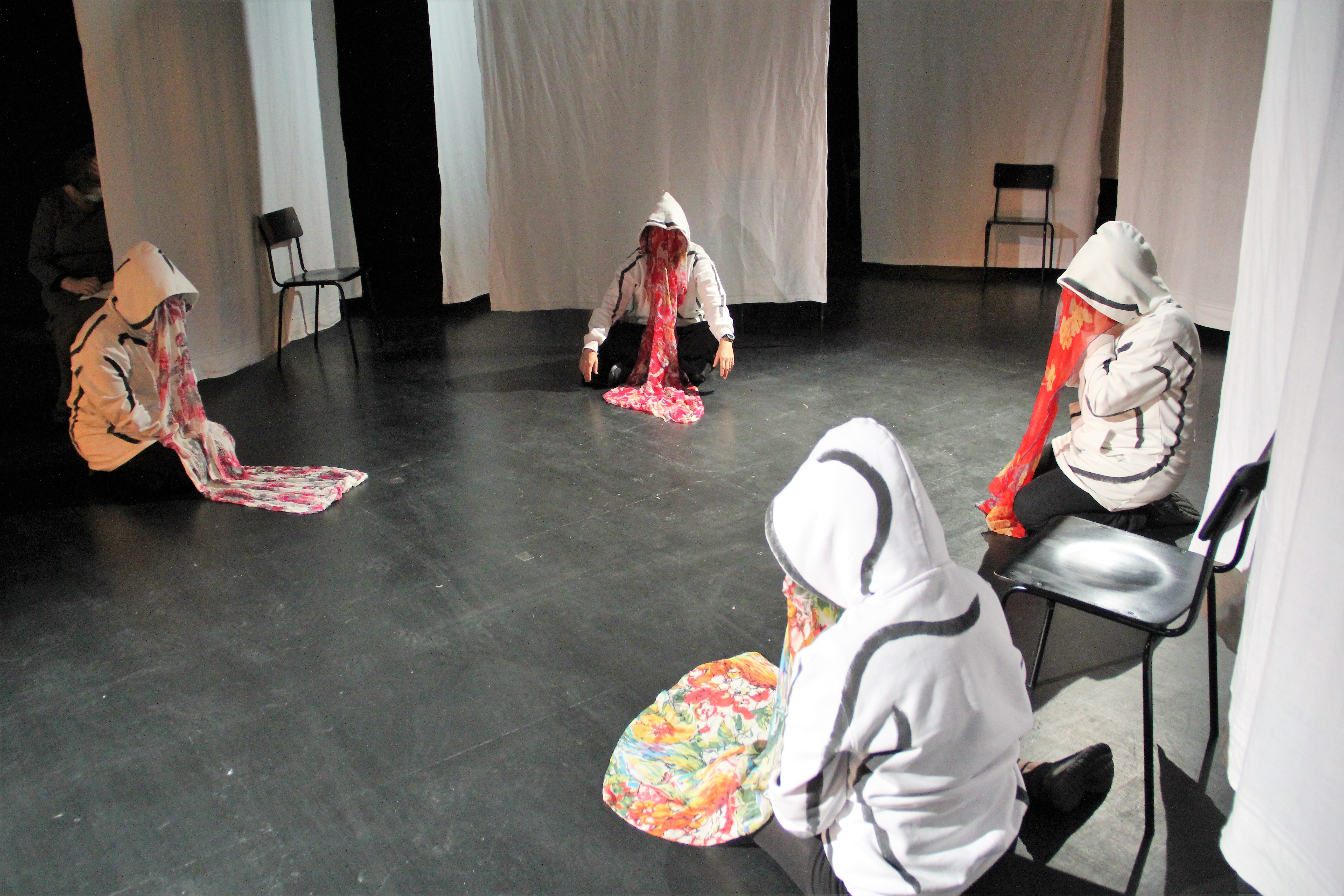 Choreografie: Anna Semenova-Ganz / Stimmperformance und Komposition: Maria Markina / Performer:innen: Dana Anderson, Maria Markina, Ann-Kathrin Quednau, Аnna Semenova-Ganz, Ksenia Vidyaykina / Sound Design: Natalia Novikova / Szenographie und Kostüm: Genia Loginova.